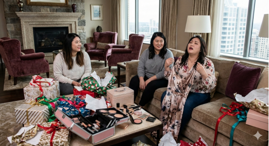A few days before a holiday party, three women sit on a couch surrounded by half-wrapped gifts and open makeup bags.